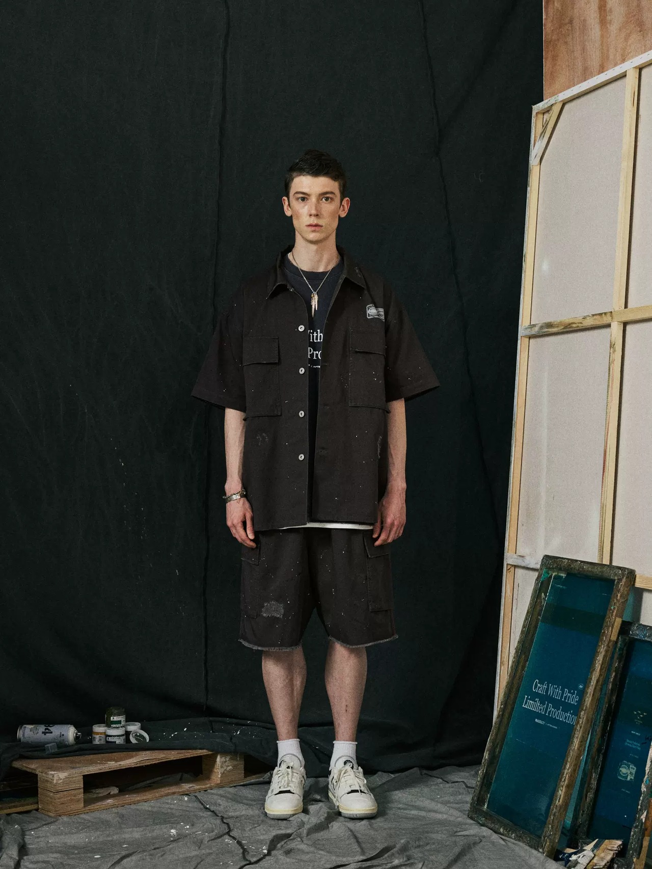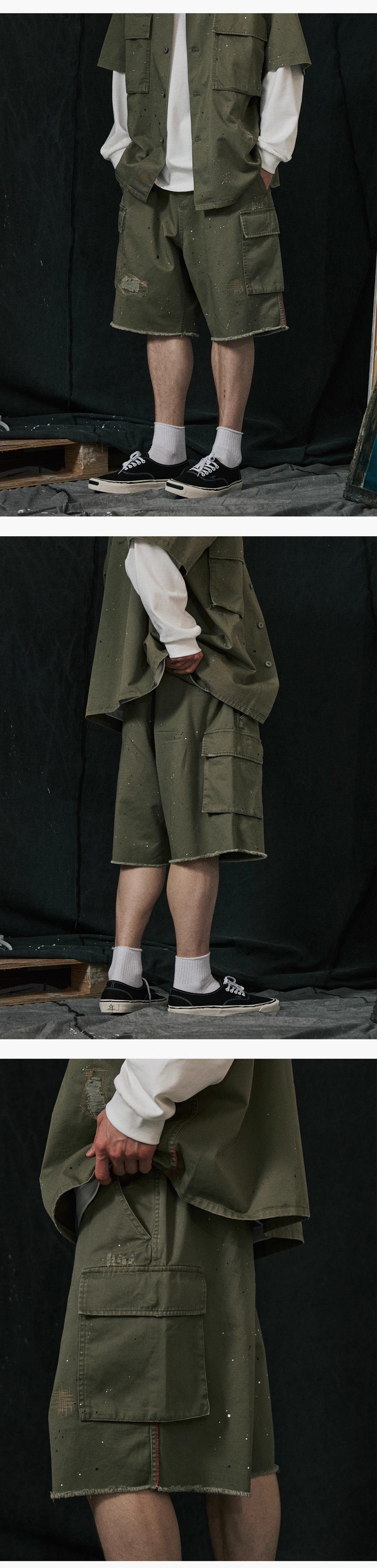 MASSULTI x AFTERWORKS コラボ 24SS ヴィンテージウォッシュ ダメージ ペイントスプラッター 大ポケット ワークショーツ